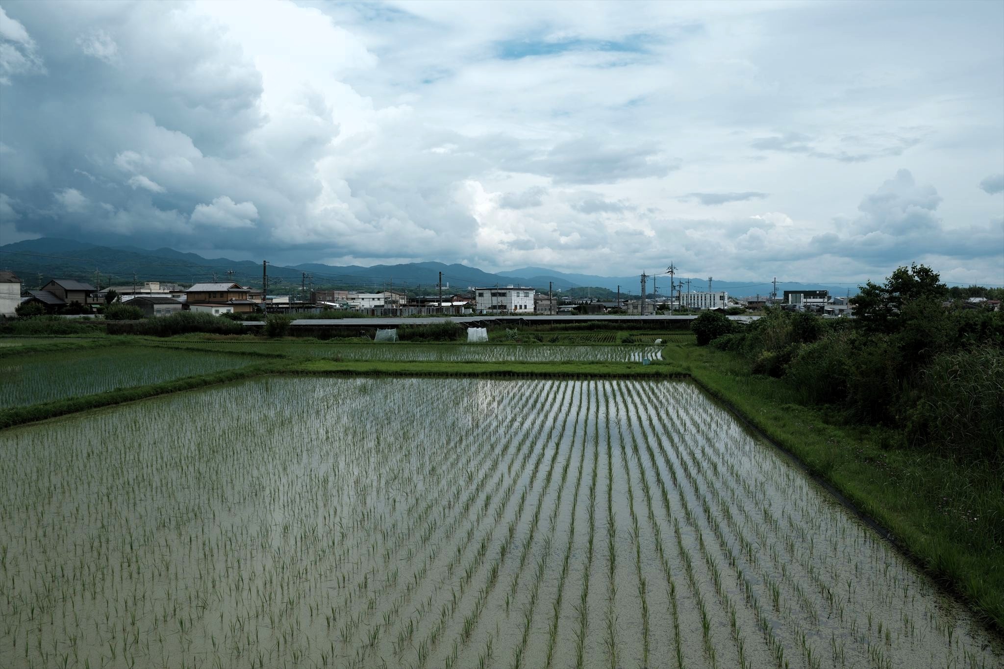 南側の田畑は、季節とともに緑を増し、その広がりがいっそう印象的になってきました。